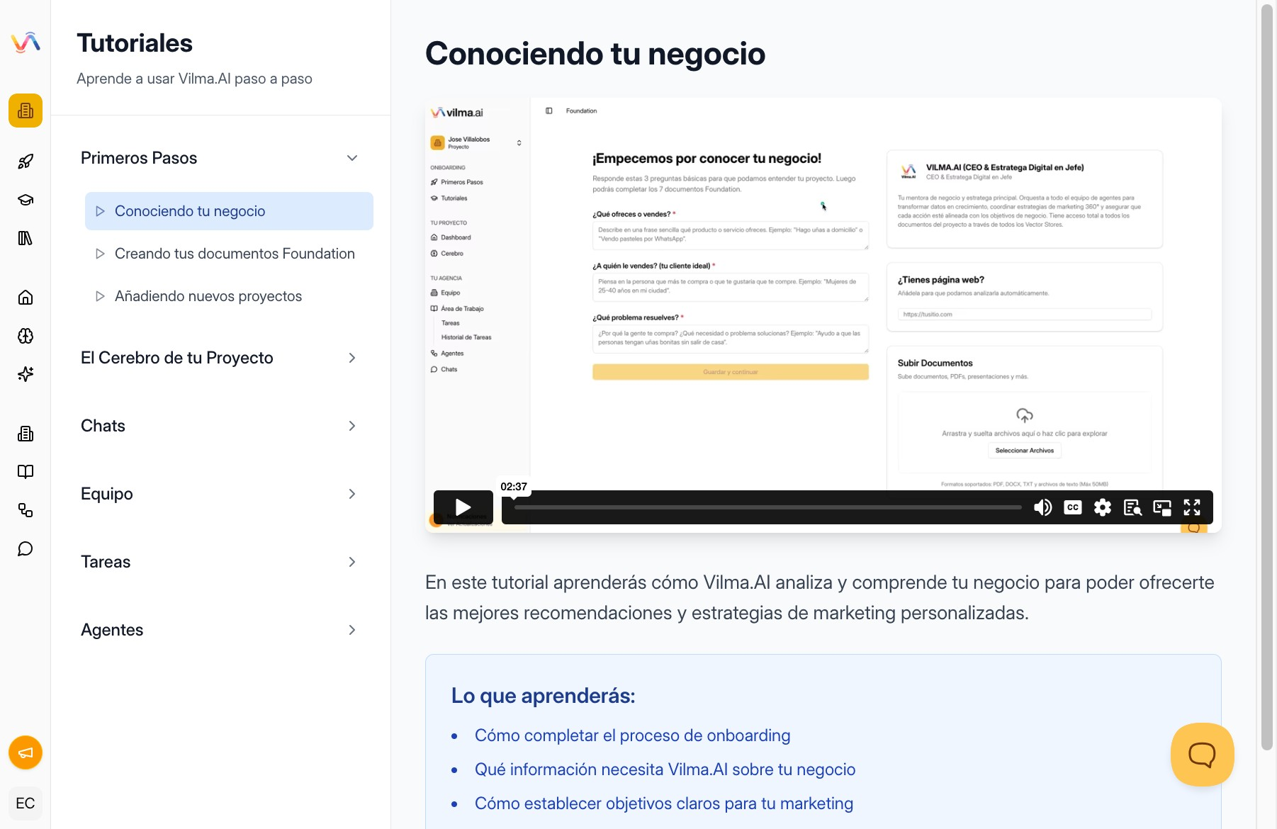 No necesitas salir del software para aprender. Tenemos una sección completa de tutoriales integrada directamente en Vilma AI.